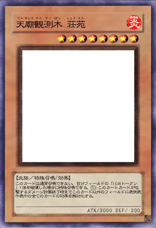 | このカードは通常召喚できない。自分フィールドの「IONトークン」1体を破壊した場合に特殊召喚できる。①:このカートカードが攻撃するダメージ計算終了時までこのカード以外のフィールドに表側表示表示の全てのカードの効果を無効化する。 | |||
