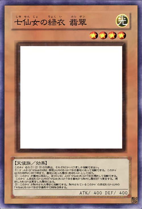 | このカード名の(1)(2)(3)の効果は、それぞれ1ターンに1度しか発動できない。 (1):デッキから「七仙女の緑衣 翡翠」以外のモンスター1体を墓地に送って発動できる。このカードは次の相手ターン終了時まで、墓地に送った属性・同名モンスターとして扱う。 (2):このカードが墓地に存在し、自分フィールド上の「七仙女」モンスター1体を選択して発動できる。 このカードと同名モンスター以外の「七仙女」モンスター1体を墓地から除外し属性を1つ宣言する。選択したモンスターは宣言した属性になる。 (3):このカードが除外された場合に発動できる。除外されているこのカードの同名モンスター以外の「七仙女」モンスター1体を守備表示で特殊召喚する。 | |||