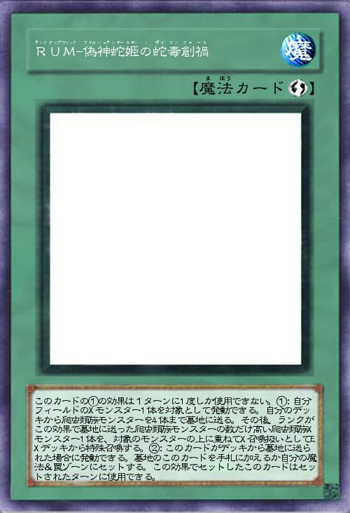 | このカードの①の効果は1ターンに1度しか使用できない。①:自分フィールドのXモンスター1体を対象として発動できる。自分のデッキから爬虫類族モンスターを4体まで墓地に送る。その後、ランクがこの効果で墓地に送った爬虫類族モンスターの数だけ高い爬虫類族Xモンスター1体を、対象のモンスターの上に重ねてX召喚扱いとしてEXデッキから特殊召喚する。②:このカードがデッキから墓地に送られた場合に発動できる。墓地のこのカードを手札に加えるか自分の魔法&罠ゾーンにセットする。この効果でセットしたこのカードはセットされたターンに使用できる。 | |||