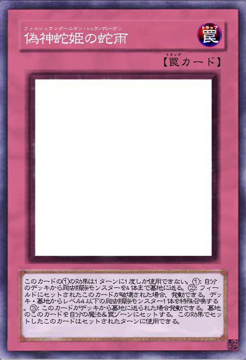 ①は単なるスネークレインの下位互換..のように見えて少し違う。あちらは通常魔法だが、必ず4体送らなければならず、下手すると爬虫類が枯渇する可能性もある。他方こちらはまで、なので任意の数送ることができる。罠・魔法の差もあり、状況によりけり。ただ、スネークレインよりも強いのが②③がついていること。②の効果は素直に強力で、墓地のみならずデッキからも出せるのは墓地の爬虫類を攻撃力の参照値にする偽神蛇姫にはありがたい効果。そうでなくとも、一度②の効果が発動すれば相手は除去を警戒せざるを得なくなる。優秀。」(2020-07-05 16:09)