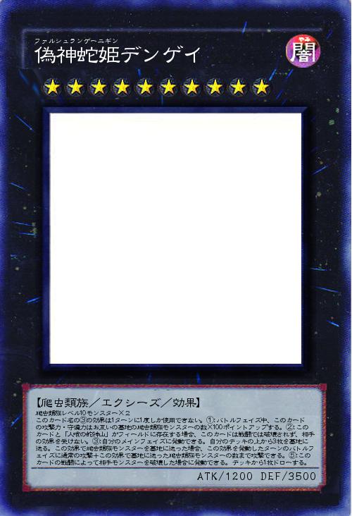 | 爬虫類族レベル10モンスター×2 このカード名の③の効果は1ターンに1度しか使用できない。①:バトルフェイズ中、このカードの攻撃力・守備力はお互いの墓地の爬虫類族モンスターの数×100ポイントアップする。②:このカードと「人喰の蛇神山」がフィールドに存在する場合、このカードは戦闘では破壊されず、相手の効果を受けない。③:自分のメインフェイズに発動できる。自分のデッキの上から3枚を墓地に送る。この効果で爬虫類族モンスターを墓地に送った場合、この効果を発動したターンのバトルフェイズに通常の攻撃+この効果で墓地に送った爬虫類族モンスターの数まで攻撃できる。⑤:このカードの戦闘によって相手モンスターを破壊した場合に発動できる。デッキから1枚ドローする。 | |||