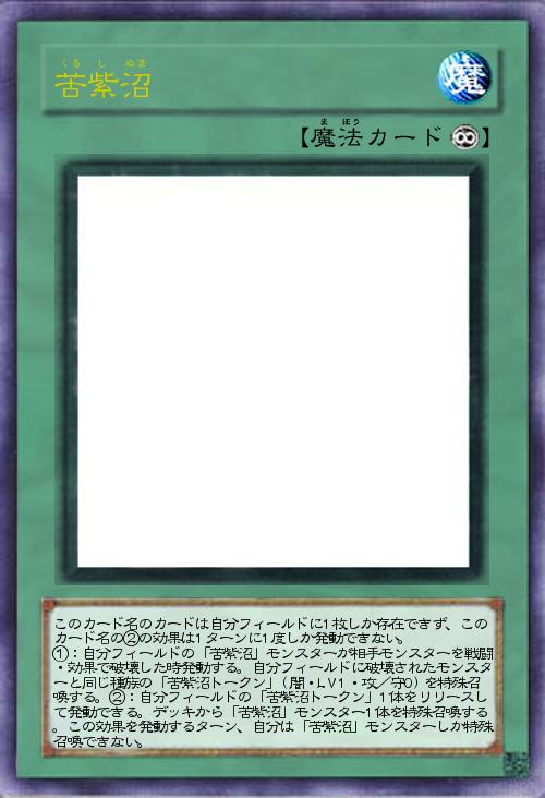 | このカード名のカードは自分フィールドに1枚しか存在できず、このカード名の②の効果は1ターンに1度しか発動できない。 ①:自分フィールドの「苦紫沼」モンスターが相手モンスターを戦闘・効果で破壊した時発動する。自分フィールドに破壊されたモンスターと同じ種族の「苦紫沼トークン」(闇・LV1・攻/守0)を特殊召喚する。②:自分フィールドの「苦紫沼トークン」1体をリリースして発動できる。デッキから「苦紫沼」モンスター1体を特殊召喚する。この効果を発動するターン、自分は「苦紫沼」モンスターしか特殊召喚できない。 | |||