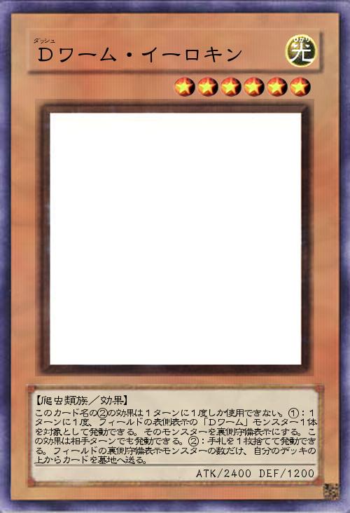 | このカード名の②の効果は1ターンに1度しか使用できない。①:1ターンに1度、フィールドの表側表示の「Dワーム」モンスター1体を対象として発動できる。そのモンスターを裏側守備表示にする。この効果は相手ターンでも発動できる。②:手札を1枚捨てて発動できる。フィールドの裏側守備表示モンスターの数だけ、自分のデッキの上からカードを墓地へ送る。 | |||