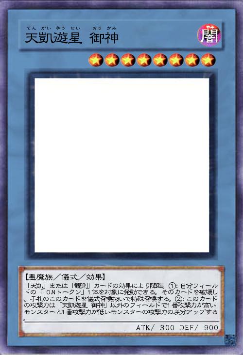 | 「天凱」または「観測」カードの効果により降臨。①:自分フィールドの「IONトークン」1体を対象に発動できる。そのカードを破壊し、手札のこのカードを儀式召喚扱いで特殊召喚する。②:このカードの攻撃力は「天凱遊星 御神」以外のフィールドで1番攻撃力が高いモンスターと1番攻撃力が低いモンスターの攻撃力の差分アップする。 | |||