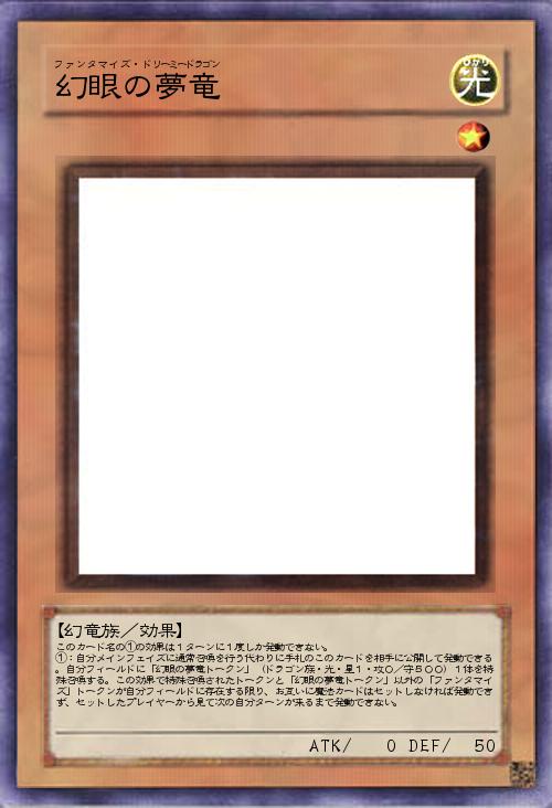 | このカード名の①の効果は1ターンに1度しか発動できない。 ①:自分メインフェイズに通常召喚を行う代わりに手札のこのカードを相手に公開して発動できる。自分フィールドに「幻眼の夢竜トークン」(ドラゴン族・光・星1・攻0/守500)1体を特殊召喚する。この効果で特殊召喚されたトークンと「幻眼の夢竜トークン」以外の「ファンタマイズ」トークンが自分フィールドに存在する限り、お互いに魔法カードはセットしなければ発動できず、セットしたプレイヤーから見て次の自分ターンが来るまで発動できない。 | |||