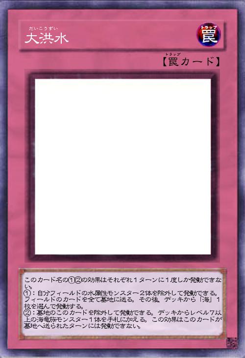 「文明都市を水没させるほどの大雨を降らせた洪水神話を元にして作ったカードです。モンスター2体を贄にし、フィールドの全てを溺れさせるほどの大雨を降らせます。そしてその雨で海を作り出す。というのが①の効果です。そして②の効果で、大雨を降らせた神の存在をチラつかせました。」(2020-07-07 21:33)