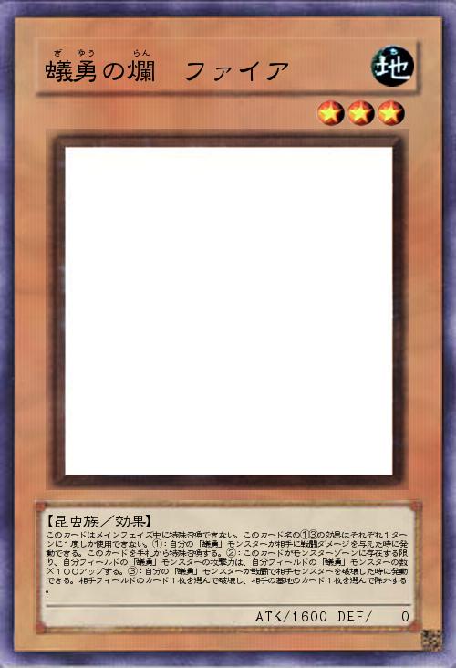 | このカードはメインフェイズ中に特殊召喚できない。このカード名の①③の効果はそれぞれ1ターンに1度しか使用できない。①:自分の「蟻勇」モンスターが相手に戦闘ダメージを与えた時に発動できる。このカードを手札から特殊召喚する。②:このカードがモンスターゾーンに存在する限り、自分フィールドの「蟻勇」モンスターの攻撃力は、自分フィールドの「蟻勇」モンスターの数×100アップする。③:自分の「蟻勇」モンスターが戦闘で相手モンスターを破壊した時に発動できる。相手フィールドのカード1枚を選んで破壊し、相手の墓地のカード1枚を選んで除外する。 | |||