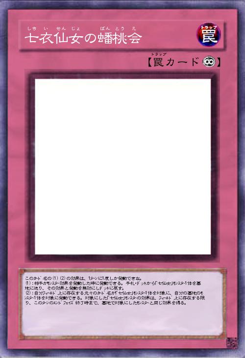 | このカード名の(1)(2)の効果は、1ターンに1度しか発動できな。 (1):相手がモンスター効果を発動した時に発動できる。手札・デッキから「七仙女」モンスター1体を墓地に送り、その効果と発動を無効にしデッキに戻す。 (2):自分フィールド上に存在する元々のカード名が「七仙女」モンスター1体を対象に、自分の墓地のモンスター1体を対象に発動できる。対象にした「七仙女」モンスターの効果は、フィールド上に存在する限り、このターンのエンドフェイズ終了時まで、墓地で対象にしたモンスターと同じ効果を得る。 | |||