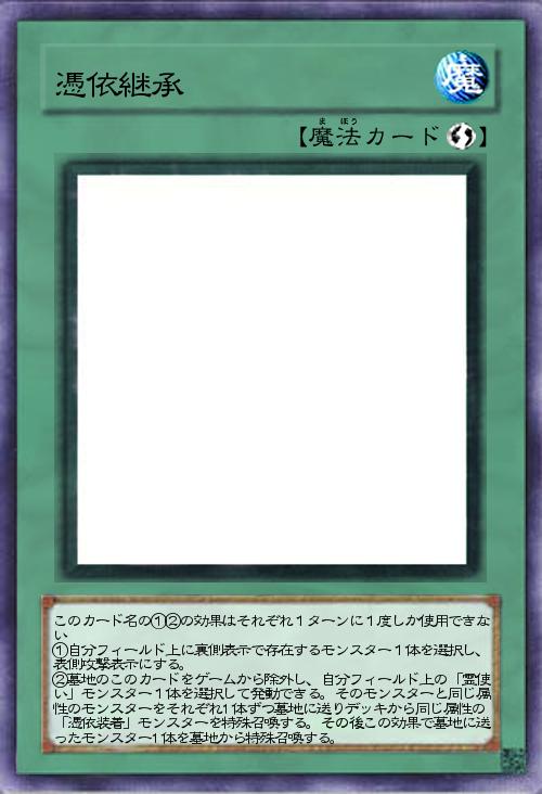| このカード名の①②の効果はそれぞれ1ターンに1度しか使用できない ①自分フィールド上に裏側表示で存在するモンスター1体を選択し、表側攻撃表示にする。 ②墓地のこのカードをゲームから除外し、自分フィールド上の「霊使い」モンスター1体を選択して発動できる。そのモンスターと同じ属性のモンスターをそれぞれ1体ずつ墓地に送りデッキから同じ属性の「憑依装着」モンスターを特殊召喚する。その後この効果で墓地に送ったモンスター1体を墓地から特殊召喚する。 | |||