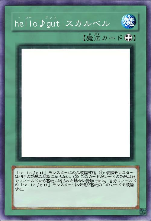 | 「hello♪gut」モンスターにのみ装備可能。①:装備モンスターは相手の効果の対象にならない。②:このカードがカードの効果以外でフィールドから墓地に送られた場合に発動できる。自分フィールドの「hello♪gut」モンスター1体を選び墓地のこのカードを装備する。 | |||