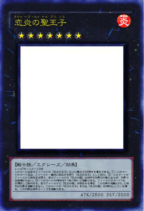 | レベル7モンスター×2体 このカードは自分フィールドの「恋炎の王子」の上に重ねてX召喚する事もできる。①:このカードのカード名は、フィールド・墓地に存在する限り「恋炎の王子」として扱う。②:このカードがフィールドに存在する限り、自分フィールドの「恋炎の姫」は相手の効果の対象にならず、効果では破壊されない。③:このカードのX素材を1つ取り除いて発動できる。フィールドのカード1枚を選択して除外する。自分フィールドに「恋炎の姫」が存在する場合、この効果の発動に対して相手は効果を発動できない。このカードが「恋炎の王子」または「恋炎の姫」をX素材としている場合、この効果は相手ターンでも発動できる。 | |||