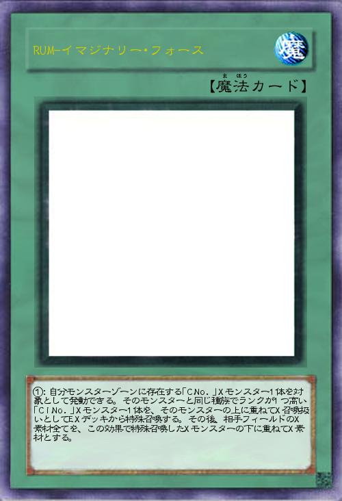 | ①:自分モンスターゾーンに存在する「CNo.」Xモンスター1体を対象として発動できる。そのモンスターと同じ種族でランクが1つ高い「CiNo.」Xモンスター1体を、そのモンスターの上に重ねてX召喚扱いとしてEXデッキから特殊召喚する。その後、相手フィールドのX素材全てを、この効果で特殊召喚したXモンスターの下に重ねてX素材とする。 | |||