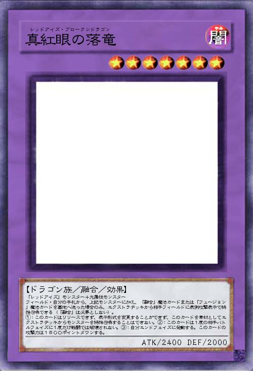 | 「レッドアイズ」モンスター+光属性モンスター フィールド・自分の手札から、上記モンスターに加え、「融合」魔法カードまたは「フュージョン」魔法カードを墓地へ送った場合のみ、エクストラデッキから相手フィールドに表側攻撃表示で特殊召喚できる(「融合」は必要としない)。 ①:このカードはリリースできず、表示形式を変更することができず、このカードを素材としてエクストラデッキからモンスターを特殊召喚することはできない。②:このカードは1度の相手バトルフェイズに1度だけ戦闘では破壊されない。③:自分エンドフェイズに発動する。このカードの攻撃力は1500ポイントダウンする。 | |||