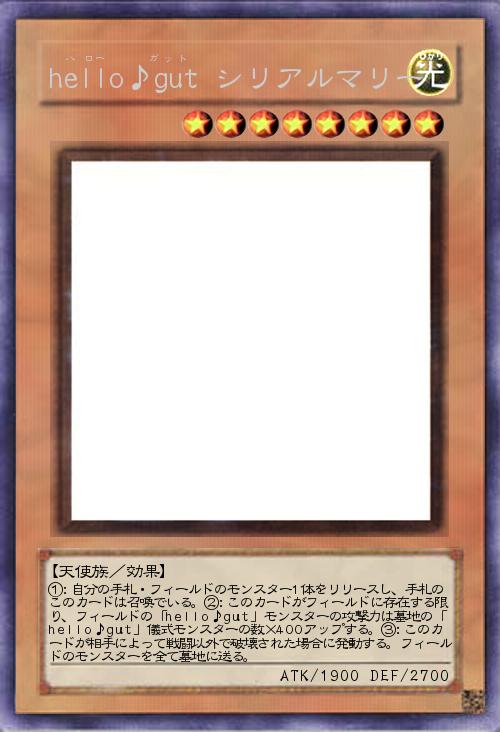 | ①:自分の手札・フィールドのモンスター1体をリリースし、手札のこのカードは召喚でいる。②:このカードがフィールドに存在する限り、フィールドの「hello♪gut」モンスターの攻撃力は墓地の「hello♪gut」儀式モンスターの数×400アップする。③:このカードが相手によって戦闘以外で破壊された場合に発動する。フィールドのモンスターを全て墓地に送る。 | |||