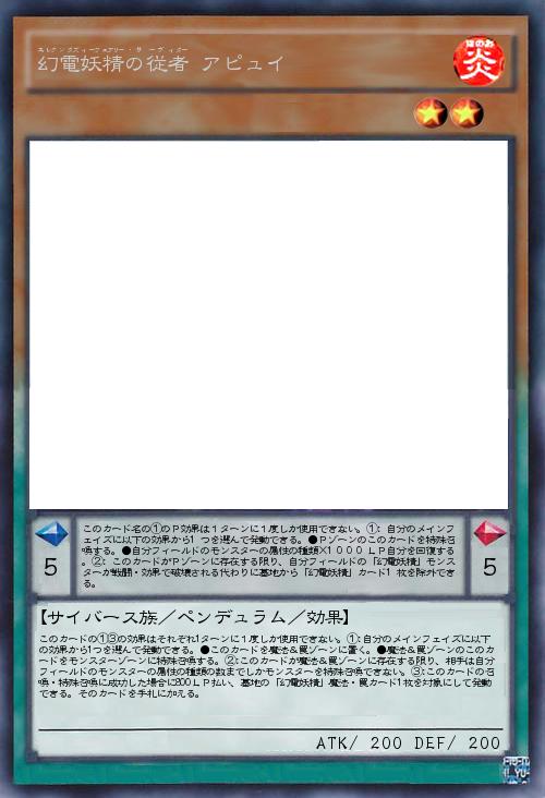 | このカード名の①のP効果は1ターンに1度しか使用できない。①:自分のメインフェイズに以下の効果から1つを選んで発動できる。●Pゾーンのこのカードを特殊召喚する。●自分フィールドのモンスターの属性の種類×1000LP自分を回復する。②:このカードがPゾーンに存在する限り、自分フィールドの「幻電妖精」モンスターが戦闘・効果で破壊される代わりに墓地から「幻電妖精」カード1枚を除外できる。 | |||