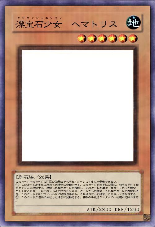 | このカード名のカードの①②の効果はそれぞれ1ターンに1度しか発動できない。 ①:このカードが手札に加わった場合に発動できる。このカードを相手に公開し、相手の手札1枚をランダムに選択する。選択した相手カードを確認し、そのカードが魔法・罠カードだった場合、もしくはこのカード以下のレベルを持つモンスターカードだった場合、その相手カードを墓地に送り、このカードを自分フィールドに特殊召喚する。それ以外だった場合、このカードを除外する。 ②:このカードが召喚に成功した場合に発動できる。相手の手札をランダムに一枚選んで除外する。 | |||