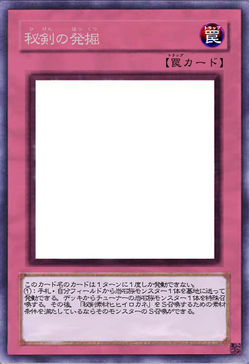 | このカード名のカードは1ターンに1度しか発動できない。 ①:手札・自分フィールドから岩石族モンスター1体を墓地に送って発動できる。デッキからチューナーの岩石族モンスター1体を特殊召喚する。その後、「秘剣素材ヒヒイロカネ」をS召喚するための素材条件を満たしているならそのモンスターのS召喚ができる。 | |||