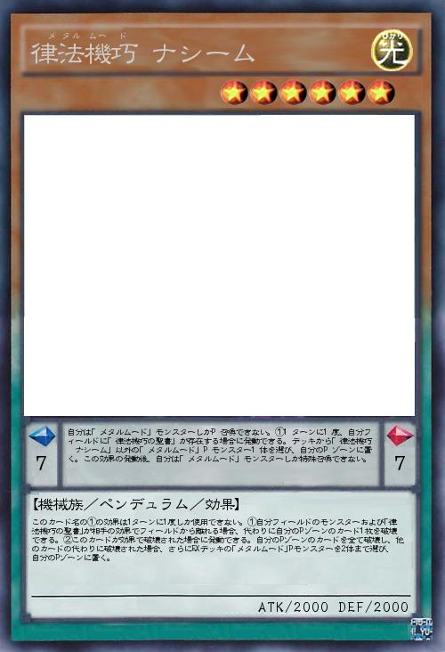 | 自分は「メタルムード」モンスターしかP召喚できない。①1ターンに1度、自分フィールドに「律法機巧の聖書」が存在する場合に発動できる。デッキから「律法機巧 ナシーム」以外の「メタルムード」Pモンスター1体を選び、自分のPゾーンに置く。この効果の発動後、自分は「メタルムード」モンスターしか特殊召喚できない。 | |||