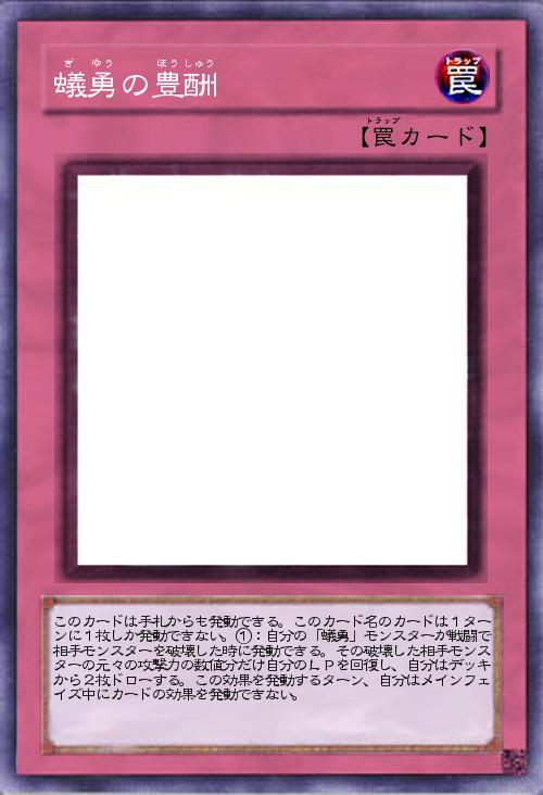| このカードは手札からも発動できる。このカード名のカードは1ターンに1枚しか発動できない。①:自分の「蟻勇」モンスターが戦闘で相手モンスターを破壊した時に発動できる。その破壊した相手モンスターの元々の攻撃力の数値分だけ自分のLPを回復し、自分はデッキから2枚ドローする。この効果を発動するターン、自分はメインフェイズ中にカードの効果を発動できない。 | |||