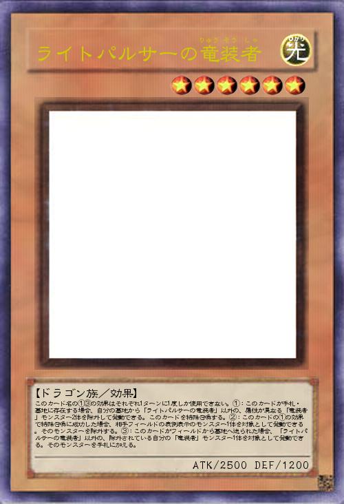 | このカード名の①③の効果はそれぞれ1ターンに1度しか使用できない。①:このカードが手札・墓地に存在する場合、自分の墓地から「ライトパルサーの竜装者」以外の、属性が異なる「竜装者」モンスター2体を除外して発動できる。このカードを特殊召喚する。②:このカードの①の効果で特殊召喚に成功した場合、相手フィールドの表側表示のモンスター1体を対象として発動できる。そのモンスターを除外する。③:このカードがフィールドから墓地へ送られた場合、「ライトパルサーの竜装者」以外の、除外されている自分の「竜装者」モンスター1体を対象として発動できる。そのモンスターを手札に加える。 | |||
