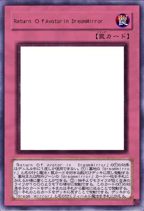 | 「Return Of Avatar In DreamMirror」の①の効果はデュエル中に1度しか使用できない。①:墓地の「dreammirror」と名の付く魔法・罠カードを好きな数だけデッキに戻し発動する。墓地または除外ゾーンの「dreammirror」カード一枚を手札に加えるか場に置くことができる。②:相手よりもライフが低く自身のライフが1000よりも下の場合に発動できる。このカードの①の効果を子のカードをデッキまたは手札から墓地に送ることで発動する。③:手札のこのカードをデッキに戻すことで発動できる。デッキから「dream mirror」と名の付くフィールド魔法を手札に加える。 | |||