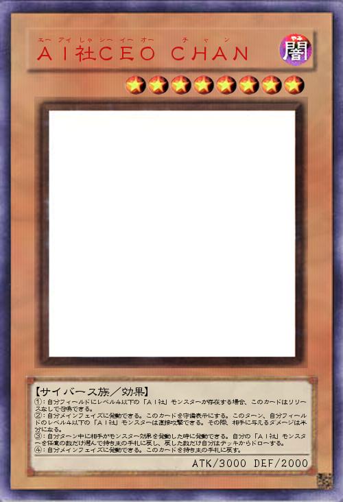 | ①:自分フィールドにレベル4以下の「AI社」モンスターが存在する場合、このカードはリリースなしで召喚できる。 ②:自分メインフェイズに発動できる。このカードを守備表示にする。このターン、自分フィールドのレベル4以下の「AI社」モンスターは直接攻撃できる。その際、相手に与えるダメージは半分になる。 ③:自分ターン中に相手がモンスター効果を発動した時に発動できる。自分の「AI社」モンスターを任意の数だけ選んで持ち主の手札に戻し、戻した数だけ自分はデッキからドローする。 ④:自分メインフェイズに発動できる。このカードを持ち主の手札に戻す。 | |||