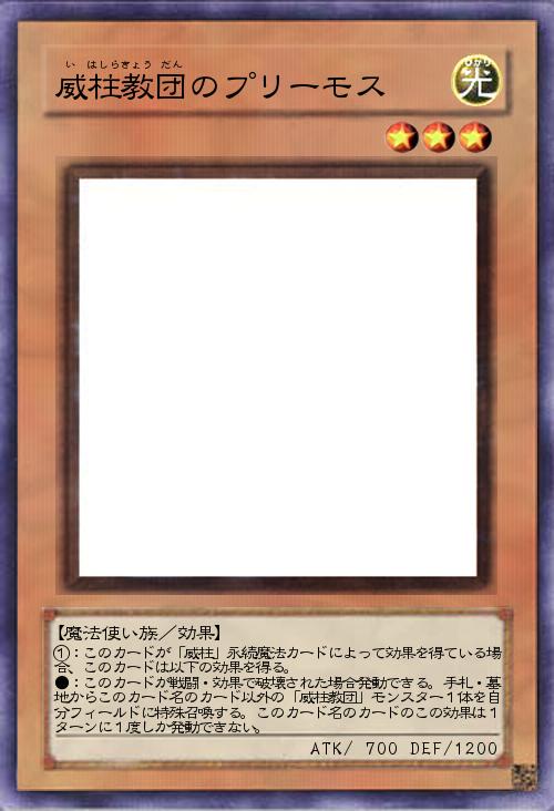 | ①:このカードが「威柱」永続魔法カードによって効果を得ている場合、このカードは以下の効果を得る。 ●:このカードが戦闘・効果で破壊された場合発動できる。手札・墓地からこのカード名のカード以外の「威柱教団」モンスター1体を自分フィールドに特殊召喚する。このカード名のカードのこの効果は1ターンに1度しか発動できない。 | |||