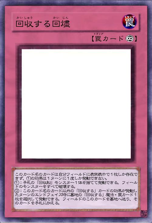 | このカード名のカードは自分フィールドに表側表示で1枚しか存在できず、①の効果は1ターンに1度しか発動できない。 ①:手札の「回収船」モンスター1体を捨てて発動できる。フィールドのモンスターをすべて破壊する。 ②:このカード名のカード以外の「回収する」カードの効果が発動したターンのエンドフェイズ時に墓地の「回収する」魔法・罠カード1枚を選択して発動できる。フィールドのこのカードを墓地へ送り、そのカードを手札に加える。 | |||