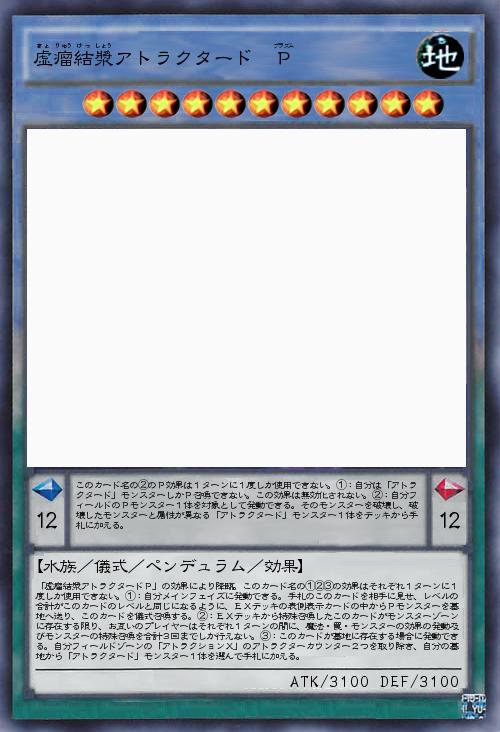 | 「虚瘤結漿アトラクタードP」の効果により降臨。このカード名の①②③の効果はそれぞれ1ターンに1度しか使用できない。①:自分メインフェイズに発動できる。手札のこのカードを相手に見せ、レベルの合計がこのカードのレベルと同じになるように、EXデッキの表側表示カードの中からPモンスターを墓地へ送り、このカードを儀式召喚する。②:EXデッキから特殊召喚したこのカードがモンスターゾーンに存在する限り、お互いのプレイヤーはそれぞれ1ターンの間に、魔法・罠・モンスターの効果の発動及びモンスターの特殊召喚を合計3回までしか行えない。③:このカードが墓地に存在する場合に発動できる。自分フィールドゾーンの「アトラクションX」のアトラクターカウンター2つを取り除き、自分の墓地から「アトラクタード」モンスター1体を選んで手札に加える。 | |||