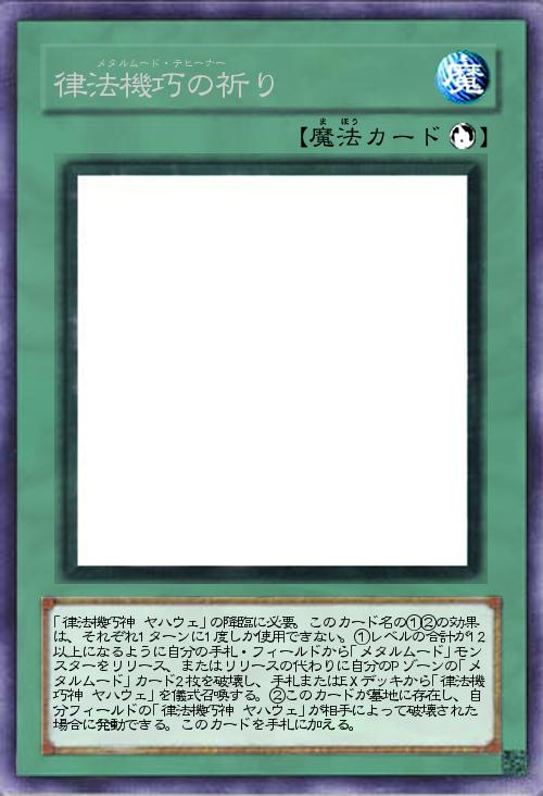 | 「律法機巧神 ヤハウェ」の降臨に必要。このカード名の①②の効果は、それぞれ1ターンに1度しか使用できない。①レベルの合計が12以上になるように自分の手札・フィールドから「メタルムード」モンスターをリリース、またはリリースの代わりに自分のPゾーンの「メタルムード」カード2枚を破壊し、手札またはEXデッキから「律法機巧神 ヤハウェ」を儀式召喚する。②このカードが墓地に存在し、自分フィールドの「律法機巧神 ヤハウェ」が相手によって破壊された場合に発動できる。このカードを手札に加える。 | |||