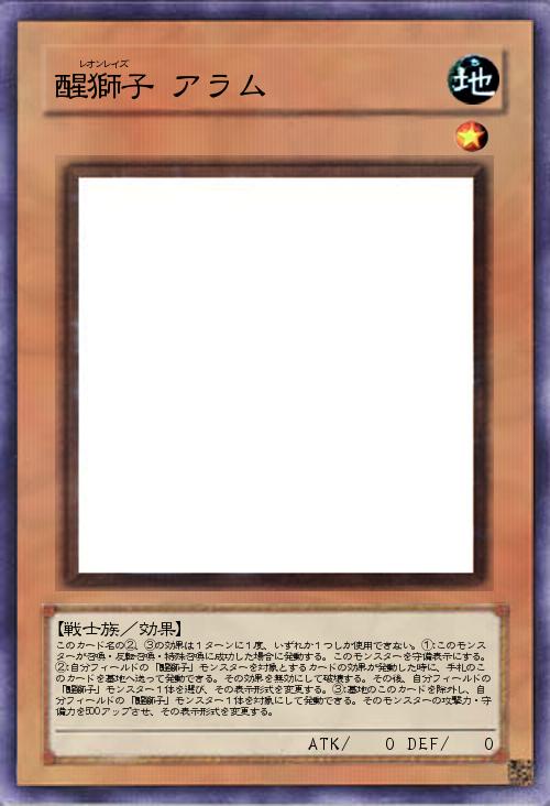 「おそらく上級モンスターばかりの重量級デッキなので、サポート用の下級は存在するだろうと思いこの効果に。名前の由来は「アラーム」で、その名の通り寝ている上級醒獅子を叩き起こす効果になっています。流石に攻撃表示時の能力倍加効果は書くとテキスト過多になりそうだったので、攻守0にして消しています。」(2020-07-22 12:44)