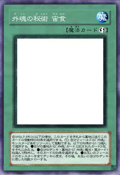 | 自分のLPが500以下の場合、このカードを手札から墓地に送りこのカードの発動時の効果を適用できる。①:自分フィールドの「外魂」モンスター2体をリリースして発動できる。以下の効果から1つ選んで適用する。●自分の墓地から「外魂」カードと記されたカード3枚を手札に加える。●自分のデッキ・墓地から「外魂」魔法・罠カード1枚選んで除外し、そのカードの効果を適用する。●お互いのフィールドのモンスターを全てデッキに戻す。その後、お互いに自分のデッキに戻した枚数ドローする。 | |||