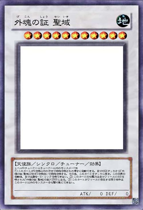 | レベル10チューナー+チューナー以外のモンスター1体 ①:このカートがS召喚以外の方法で特殊召喚された場合に発動できる。自分のEXデッキから「外魂の証 聖域」2体をS召喚扱いで特殊召喚する。その後、このカードをデッキに戻す。この効果の発動後、自分は融合・X・リンク召喚できない。②:このカードの攻撃力は自分フィールドのS召喚された「外魂の証 聖域」の数×2000となる。③:このカートがフィールド存在する限り相手はこのカード以外のモンスターを攻撃対象にできない。 | |||