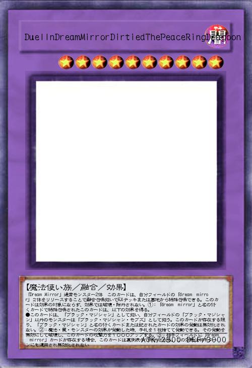 | 「Dream Mirror」通常モンスター2体 このカードは、自分フィールドの「dream mirror」2体をリリースすることで融合召喚扱いでEXデッキまたは墓地から特殊召喚できる。このカードは効果の対象にならず、効果では破壊・除外されない。①:「dream mirror」と名の付くカードで特殊召喚されたこのカードは、以下の効果を得る。 ●このカードは、「ブラック・マジシャン」として扱い、自分フィールドの「ブラック・マジシャン」以外のモンスターは「ブラック・マジシャン・モブズ」として扱う。このカードが存在する限り、「ブラック・マジシャン」と名の付くカードまたは記されたカードの効果の発動は無効化されない。②:魔法・罠・モンスターの効果が発動した時、手札を1枚捨てて発動できる。その発動を無効にして破壊し、このカードの攻撃力を1000アップする。③:相手フィールドに「dream mirror」 | |||
