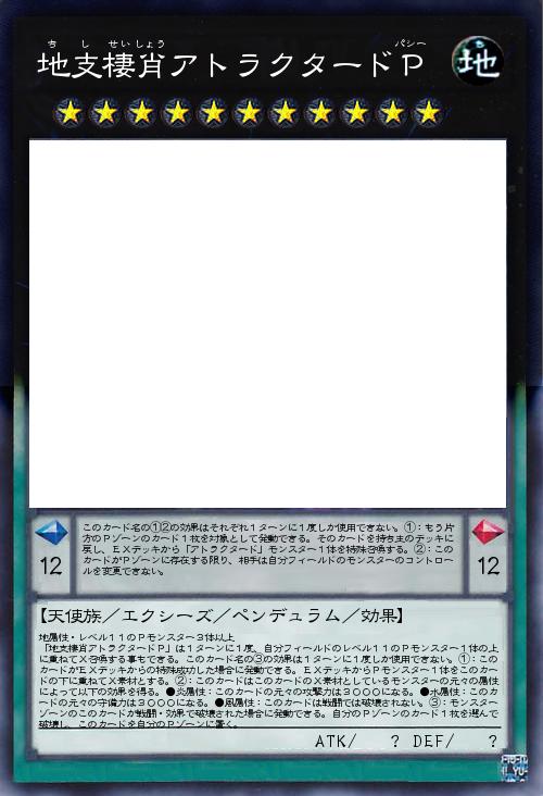 | 地属性・レベル11のPモンスター3体以上 「地支棲肖アトラクタードP」は1ターンに1度、自分フィールドのレベル11のPモンスター1体の上に重ねてX召喚する事もできる。このカード名の③の効果は1ターンに1度しか使用できない。①:このカードがEXデッキからの特殊成功した場合に発動できる。EXデッキからPモンスター1体をこのカードの下に重ねてX素材とする。②:このカードはこのカードのX素材としているモンスターの元々の属性によって以下の効果を得る。●炎属性:このカードの元々の攻撃力は3000になる。●水属性:このカードの元々の守備力は3000になる。●風属性:このカードは戦闘では破壊されない。③:モンスターゾーンのこのカードが戦闘・効果で破壊された場合に発動できる。自分のPゾーンのカード1枚を選んで破壊し、このカードを自分のPゾーンに置く。 | |||