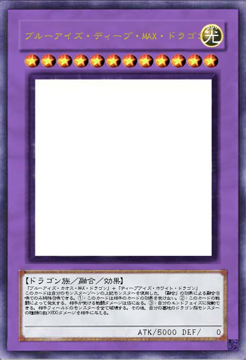 | 「ブルーアイズ・カオス・MAX・ドラゴン」+「ディープアイズ・ホワイト・ドラゴン」 このカードは自分のモンスターゾーンの上記モンスターを使用した、「融合」の効果による融合召喚でのみ特殊召喚できる。①:このカードは相手のカードの効果を受けない。②:このカードの戦闘によって発生する、相手が受ける戦闘ダメージは倍になる。③:自分のエンドフェイズに発動できる。相手フィールドのモンスターを全て破壊する。その後、自分の墓地のドラゴン族モンスターの種類の数×600ダメージを相手に与える。 | |||