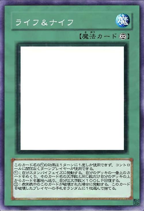 | このカード名の①の効果は1ターンに1度しか使用できず、コントロールに関係なくターンプレイヤーが使用できる。 ①:自分スタンバイフェイズに発動する。自分のデッキの一番上のカードをめくり、そのカード名の文字数と同じ数だけ自分のデッキの上からカードを墓地へ送り、自分は文字数×100LP回復する。 ②:表側表示のこのカードが破壊された場合に発動する。このカードを破壊したプレイヤーの手札をランダムに1枚選んで捨てる。 | |||