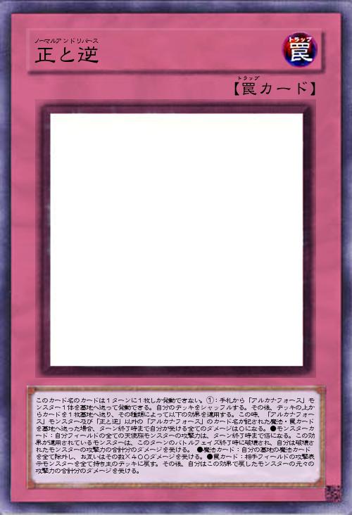 | このカード名のカードは1ターンに1枚しか発動できない。①:手札から「アルカナフォース」モンスター1体を墓地へ送って発動できる。自分のデッキをシャッフルする。その後、デッキの上からカードを1枚墓地へ送り、その種類によって以下の効果を適用する。この時、「アルカナフォース」モンスター及び「正と逆」以外の「アルカナフォース」のカード名が記された魔法・罠カードを墓地へ送った場合、ターン終了時まで自分が受ける全てのダメージは0になる。●モンスターカード:自分フィールドの全ての天使族モンスターの攻撃力は、ターン終了時まで倍になる。この効果が適用されているモンスターは、このターンのバトルフェイズ終了時に破壊され、自分は破壊されたモンスターの攻撃力の合計分のダメージを受ける。 ●魔法カード:自分の墓地の魔法カードを全て除外し、お互いはその数×400ダメージを受ける。●罠カード:相手フィールドの攻撃表示モンス | |||