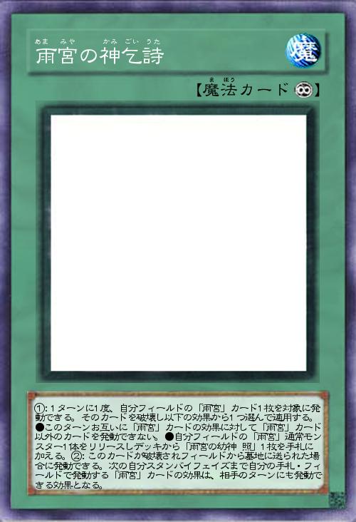 | ①:1ターンに1度、自分フィールドの「雨宮」カード1枚を対象に発動できる。そのカードを破壊し以下の効果から1つ選んで適用する。●このターンお互いに「雨宮」カードの効果に対して「雨宮」カード以外のカードを発動できない。●自分フィールドの「雨宮」通常モンスター1体をリリースしデッキから「雨宮の幼神 照」1枚を手札に加える。②:このカードが破壊されフィールドから墓地に送られた場合に発動できる。次の自分スタンバイフェイズまで自分の手札・フィールドで発動する「雨宮」カードの効果は、相手のターンにも発動できる効果となる。 | |||