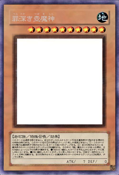 | このカードは通常召喚できない。自分のデッキの上からカード10枚を裏側表示で除外する場合のみ特殊召喚できる。このカード名の②の効果は1ターンに1度しか使用できない。①:このカードの攻撃力は裏側表示で除外されているカードの数×300アップする。②:自分の除外されている裏側表示のカードの中からランダムに2枚確認する。その中に「壺」魔法カードがあった場合、その枚数によって以下の効果が適用する。●1枚のみ:確認したカードを手札に加えるかデッキに戻し2枚ドローする。●2枚:確認したカードをデッキに戻し3枚ドローする。③自分・相手のエンドフェイズ時に発動する。自分の除外されている裏側表示のカードの中からランダムに2枚選び、デッキに戻す。 | |||