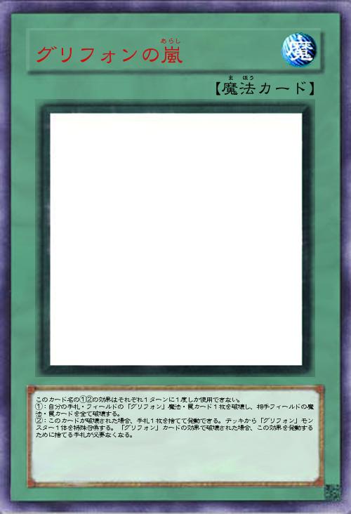 | このカード名の①②の効果はそれぞれ1ターンに1度しか使用できない。 ①:自分の手札・フィールドの「グリフォン」魔法・罠カード1枚を破壊し、相手フィールドの魔法・罠カードを全て破壊する。 ②:このカードが破壊された場合、手札1枚を捨てて発動できる。デッキから「グリフォン」モンスター1体を特殊召喚する。「グリフォン」カードの効果で破壊された場合、この効果を発動するために捨てる手札が必要なくなる。 | |||