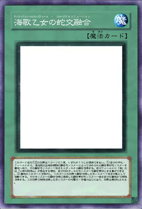 | このカード名の①②の効果は1ターンに1度、いずれか1つしか使用できない。①:自分の手札・フィールドから、海流族又は爬虫類族の融合モンスターによって決められた融合素材モンスターを墓地へ送り、その融合モンスター1体をEXデッキから融合召喚する。自分フィールドに「海」又は「人喰の蛇神山」が存在する場合、自分のEXデッキのモンスターも融合素材とする事ができる。②:墓地のこのカードを除外し、このカードの効果で融合召喚したモンスター1体を対象として発動できる。そのモンスターの融合召喚に使用した融合素材モンスター一組を自分の墓地から特殊召喚する。この効果で特殊召喚したモンスターの攻撃力・守備力は0になり、効果は無効化される。 | |||