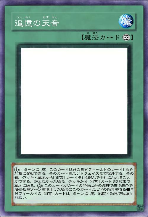 | ①:1ターンに1度、このカード以外の自分フィールドのカード1枚を対象に発動できる。そのカードをエンドフェイズまで除外する。その後、デッキ・墓地から「雨宮」カードを1枚選んで手札に加えることができる。加えなかった場合、デッキから「雨宮」カードを2枚まで墓地に送る。②:このカードがカードの発動以外の処理で表側表示で魔法&罠ゾーンを使用した場合にこのカードは以下の効果を得る●自分フィールドの「雨宮」カードは1ターンに1度、戦闘・効果で破壊されない。 | |||