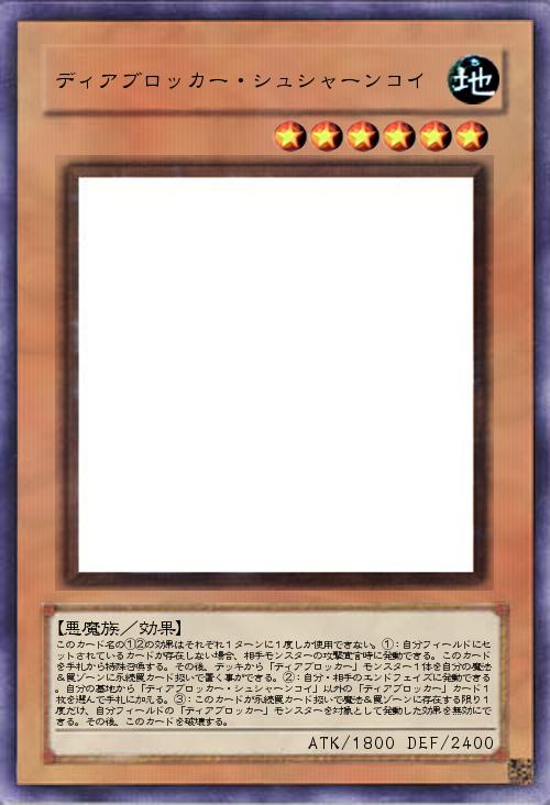 | このカード名の①②の効果はそれぞれ1ターンに1度しか使用できない。①:自分フィールドにセットされているカードが存在しない場合、相手モンスターの攻撃宣言時に発動できる。このカードを手札から特殊召喚する。その後、デッキから「ディアブロッカー」モンスター1体を自分の魔法&罠ゾーンに永続罠カード扱いで置く事ができる。②:自分・相手のエンドフェイズに発動できる。自分の墓地から「ディアブロッカー・シュシャーンコイ」以外の「ディアブロッカー」カード1枚を選んで手札に加える。③:このカードが永続罠カード扱いで魔法&罠ゾーンに存在する限り1度だけ、自分フィールドの「ディアブロッカー」モンスターを対象として発動した効果を無効にできる。その後、このカードを破壊する。 | |||