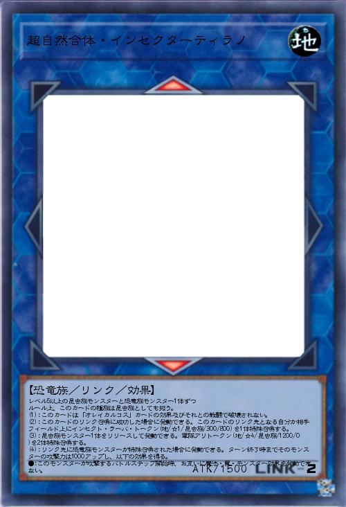 | レベル5以上の昆虫族モンスターと恐竜族モンスター1体ずつ ルール上、このカードの種族は昆虫族としても扱う。 (1):このカードは「オレイカルコス」カードの効果及びそれとの戦闘で破壊されない。 (2):このカードのリンク召喚に成功した場合に発動できる。このカードのリンク先となる自分か相手フィールド上にインセクト・ラーバ・トークン(地/☆1/昆虫族/300/800)を1体特殊召喚する。 (3):昆虫族モンスター1体をリリースして発動できる。軍隊アリトークン(地/☆4/昆虫族/1200/0)を2体特殊召喚する。 (4):リンク先に恐竜族モンスターが特殊召喚された場合に発動できる。ターン終了時までそのモンスターの攻撃力は1000アップし、以下の効果を得る。 ●:このモンスターが攻撃するバトルステップ開始時、お互いに魔法・罠・モンスター効果を発動できない。 | |||