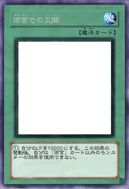 | ①:自分のLPを10000にする。この効果の発動後、自分は「雨宮」カード以外のモンスターの効果を使用できない。 | |||