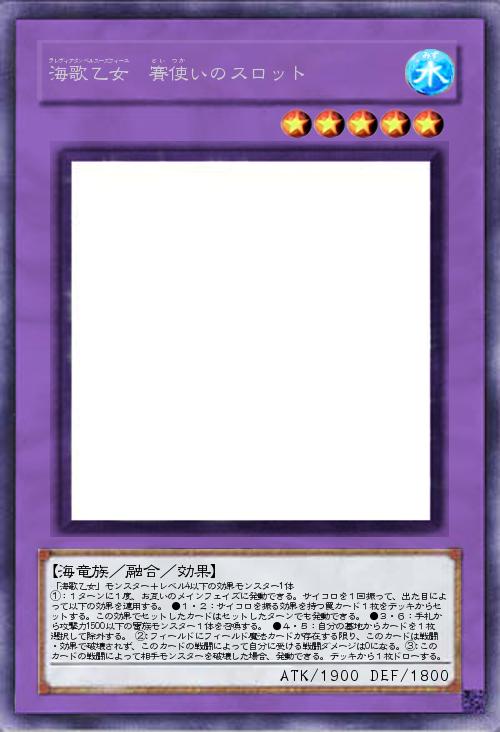 | 「海歌乙女」モンスター+レベル4以下の効果モンスター1体 ①:1ターンに1度、お互いのメインフェイズに発動できる。サイコロを1回振って、出た目によって以下の効果を適用する。 ●1・2:サイコロを振る効果を持つ罠カード1枚をデッキからセットする。この効果でセットしたカードはセットしたターンでも発動できる。 ●3・6:手札から攻撃力1500以下の雷族モンスター1体を召喚する。 ●4・5:自分の墓地からカードを1枚選択して除外する。 ②:フィールドにフィールド魔法カードが存在する限り、このカードは戦闘・効果で破壊されず、このカードの戦闘によって自分に受ける戦闘ダメージは0になる。③:このカードの戦闘によって相手モンスターを破壊した場合、発動できる。デッキから1枚ドローする。 | |||