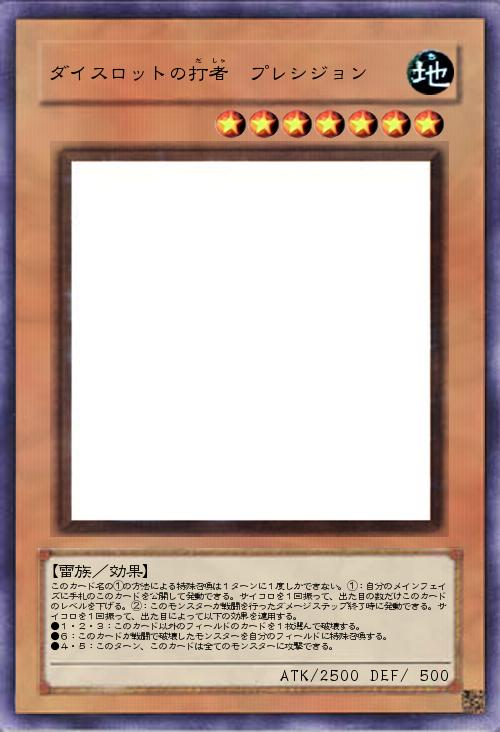 | このカード名の①の方法による特殊召喚は1ターンに1度しかできない。①:自分のメインフェイズに手札のこのカードを公開して発動できる。サイコロを1回振って、出た目の数だけこのカードのレベルを下げる。②:このモンスターが戦闘を行ったダメージステップ終了時に発動できる。サイコロを1回振って、出た目によって以下の効果を適用する。 ●1・2・3:このカード以外のフィールドのカードを1枚選んで破壊する。 ●6:このカードが戦闘で破壊したモンスターを自分のフィールドに特殊召喚する。 ●4・5:このターン、このカードは全てのモンスターに攻撃できる。 | |||