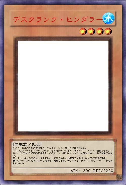| このカード名の①②の効果はそれぞれ1ターンに1度しか使用できない。 ①:相手フィールドにカードがセットされたターンの自分・相手メインフェイズに発動できる。このカードを手札から特殊召喚する。このターン、相手はセットされた魔法・罠カードを発動できない。 ②:フィールドのこのカードを素材としてX召喚した悪魔族モンスターは以下の効果を得る。 ●このカードがX召喚に成功した場合に発動できる。デッキから「デスクランク」カード1枚を手札に加える。 | |||