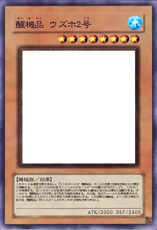 | このカードは通常召喚できない。①:このカードが「醒機品」カードの効果で特殊召喚された場合に発動する。このカード以外の自分フィールドのモンスターの攻撃力を1000アップし、このカードを破壊する。②:このカードが自身の効果以外で破壊され墓地に送られた場合に発動できる。デッキから「醒機品ウズホ2号」を2体まで特殊召喚する。その後、自分フィールドの表側表示のカードを1枚選んでこのターン終了時まで効果を無効にする。この効果の発動後、ターン終了時まで自分は「醒機品」SモンスターしかXデッキから特殊召喚できない。 | |||